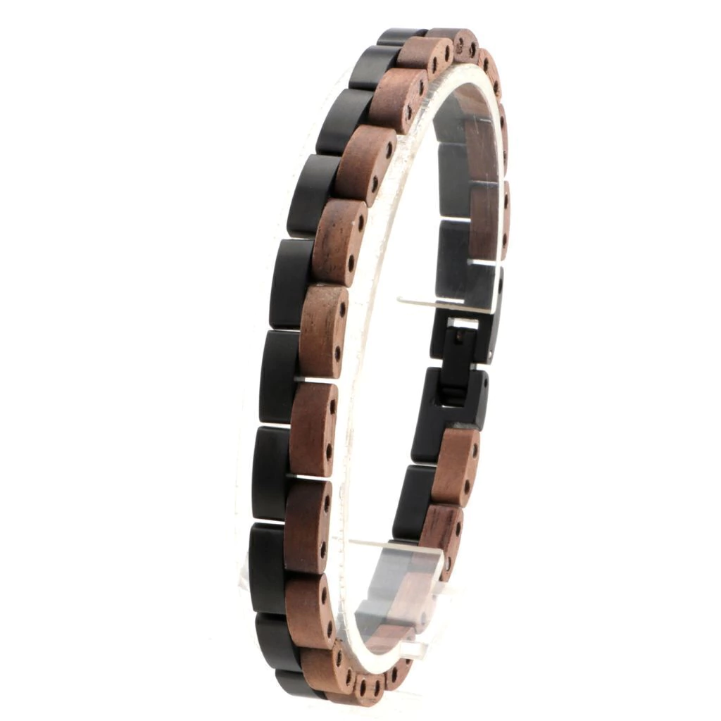 Minimalista y moderna. La pulsera Loto combina la calidez del nogal con la fuerza del acero negro, creando un contraste elegante y versátil. Un accesorio con carácter que suma estilo sin esfuerzo.