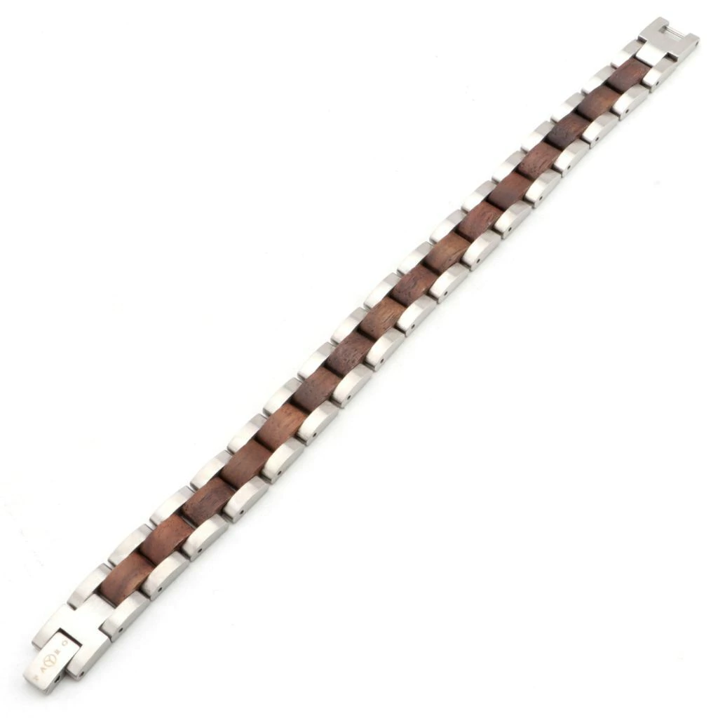 Elegancia moderna en su máxima expresión. La pulsera Nym combina la fuerza del acero inoxidable con la calidez de la madera de nogal, logrando un equilibrio perfecto entre lo urbano y lo natural. Un diseño firme y sofisticado, pensado para acompañar tu estilo día a día.