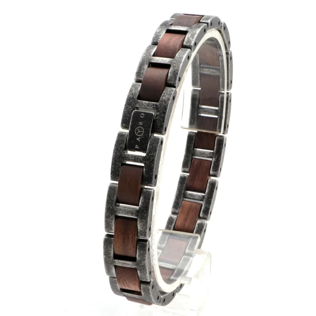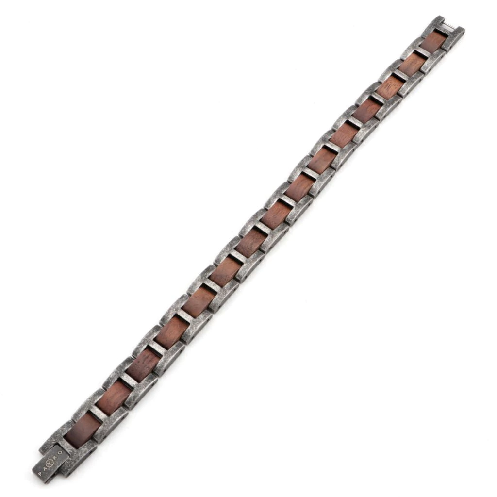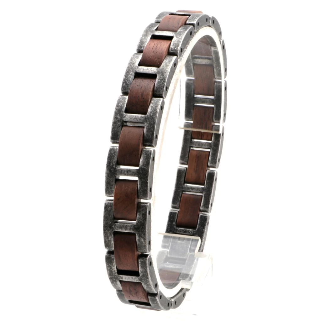 Un diseño con carácter propio. La pulsera Teak fusiona la madera de nogal con acero de acabado vintage, logrando una estética robusta y con personalidad. Ideal para quienes buscan un accesorio con aire rústico, auténtico y lleno de estilo.