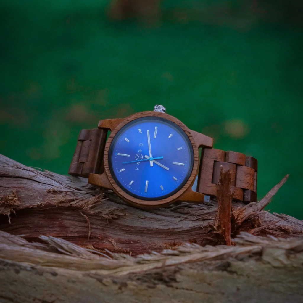 El Blue Kairos combina la calidez del nogal con un diseño más compacto y elegante. Su maquinaria japonesa garantiza precisión, mientras que su tamaño equilibrado de 41 mm lo convierte en el reloj ideal para quienes buscan sofisticación sin perder comodidad.