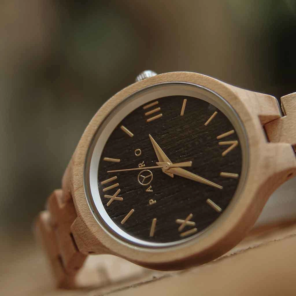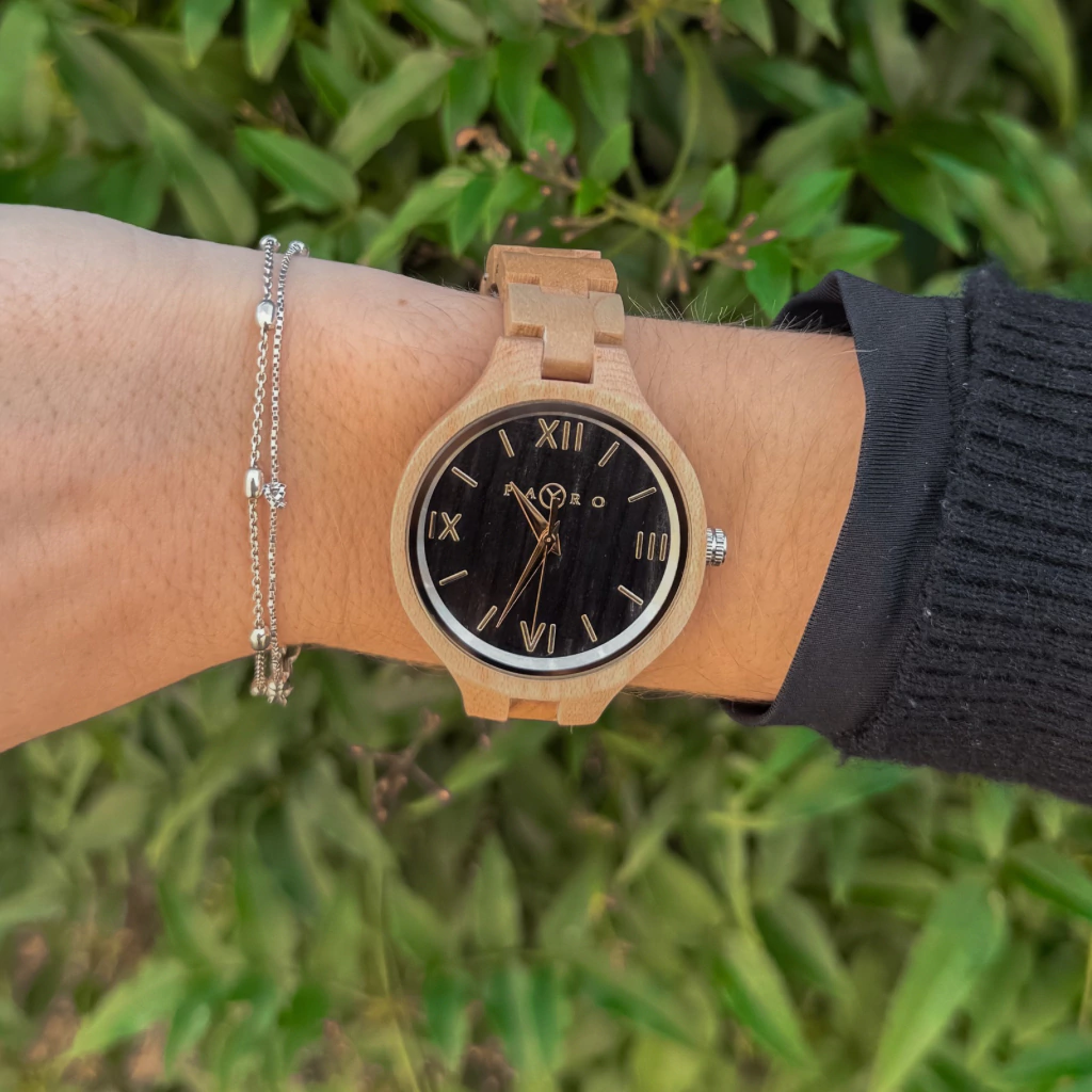 El Juno está hecho en madera de maple, de tono claro y textura suave, ideal para quienes prefieren un diseño limpio y liviano. Su caja de 36 mm y su perfil refinado lo convierten en un reloj sutil, versátil y naturalmente elegante.